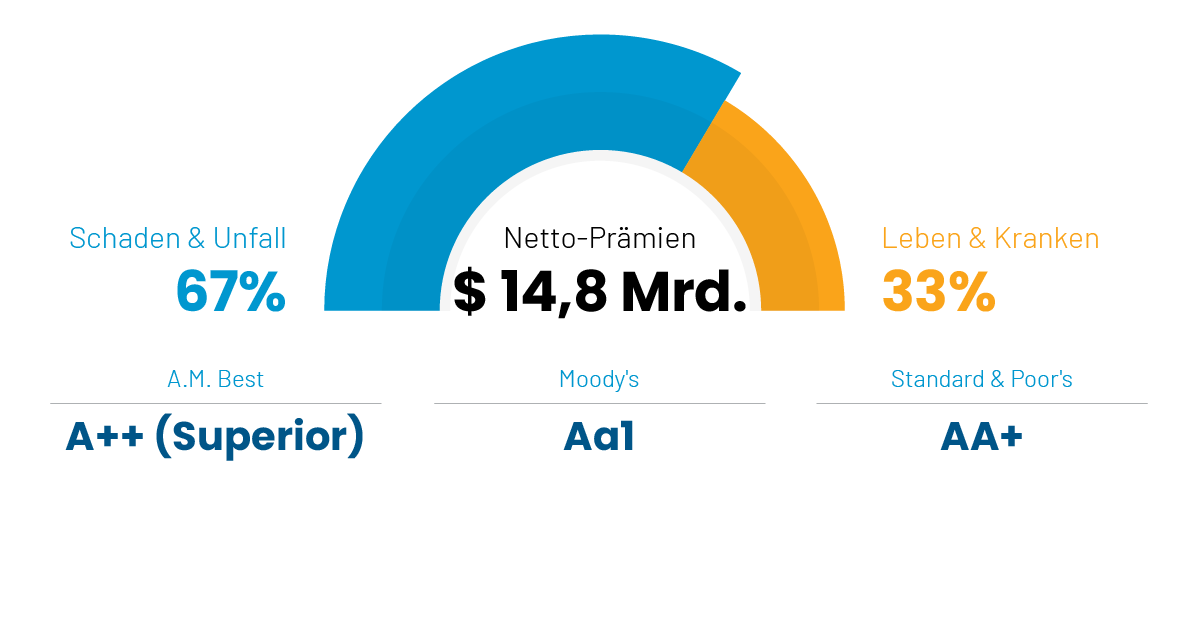 Die Gen Re ist Teil der Berkshire Hathaway Gruppe. Unsere Finanz­stärke erhielt hervor­ragende Bewer­tungen durch die inter­nationalen Rating-Agenturen. Mit einem Eigen­kapital von USD 20,0 Mrd. und Netto-Prämien­einnahmen von USD 14,8 Mrd. versprechen wir nur, was wir auch halten können.